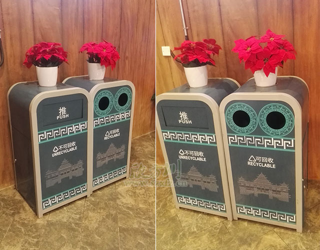 比如这款颇受各个景区欢迎的钢制果皮箱,外形上设计美观,新颖独特。桶体丝印独具匠心,桶身彩画采用一次注塑成形工艺,能有效防刮花、防掉色、耐腐蚀,经得起风吹日晒雨淋。上面还丝印了景区独有的景区剪影,彰显了艺术特色,与景区环境很好的相匹配,使的景区钢制垃圾桶与景区环境之间二者相得益彰。整体造型增加了不少的设计创意和文化气息,也提升了不少景区自身的文化价值。