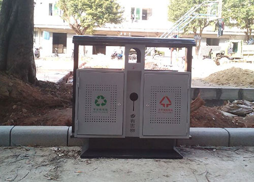 每个垃圾分类定投点均有1个小型可腐烂垃圾箱、1个大型不可腐烂垃圾箱。垃圾箱材质不再是塑料桶,而是便于清洗,不容易破坏的不锈钢材质。